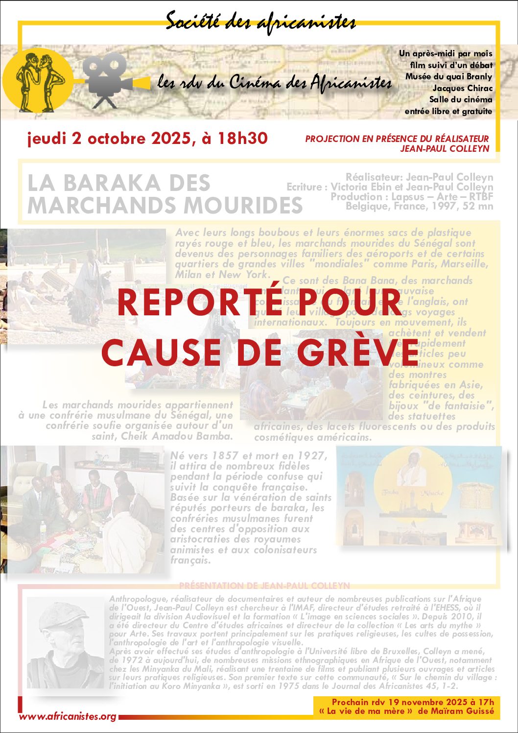 Reporté : jeudi 2 octobre 2025, à 18h30 LA BARAKA DES MARCHANDS MOURIDSES Réalisateur : Jean-Paul Colleyn Écriture : Victoria Ebin et Jean-Paul Colleyn Production : Lapsus – Arte – RTBF Belgique, France, 1997, 52 mn Avec leurs longs boubous et leurs énormes sacs de plastique rayés rouge et bleu, les marchands mourides du Sénégal… Lire la suite »
