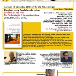 Présentation d’ouvrage en présence de l’auteur 16 rue Suger, 75006 Paris mercredi 19 novembre 2025 à 18h à la Maison Suger La Société des Africanistes accueille à la Maison Suger, ANDRÁS ZEMPLENI (anthropologue, CNRS, LESC) qui présente et discute l’ouvrage de CHARLES-HENRY PRADELLES de LATOUR (anthropologue, CNRS, LAS, psychothérapeute,ASE) « Le désir et ses rites…. Lire la suite »