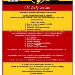 L’ASSEMBLÉE GÉNÉRALE de l’année 2025 aura lieu jeudi 29 janvier 2026 à 15h00 Musée du quai Branly – Jacques Chirac, 222, rue de l’Université – 75007 Paris (Salle de Cinéma) ORDRE DU JOUR : 1. Rapport moral et rapport d’activité 2. Rapport financier 3. Édition du Journal des africanistes 4. Questions diverses *Au cours de… Lire la suite »
