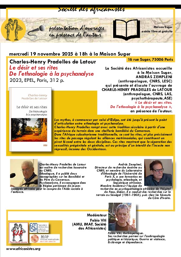 La Société des Africanistes accueille à la Maison Suger, ANDRÁS ZEMPLENI (anthropologue, CNRS, LESC) qui présente et discute l’ouvrage de CHARLES-HENRY PRADELLES de LATOUR (anthropologue, CNRS, LAS, psychothérapeute,ASE) « Le désir et ses rites. De l’ethnologie à la psychanalyse », en présence de l’auteur.
