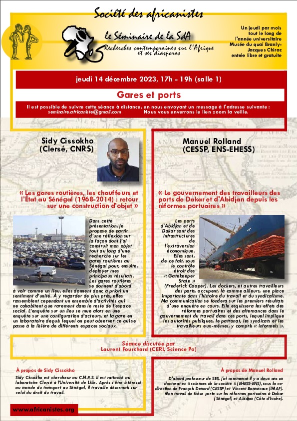Manuel Rolland (CESSP, ENS-EHESS) “Le gouvernement des travailleurs des ports de Dakar et d’Abidjan depuis les réformes portuaires.”