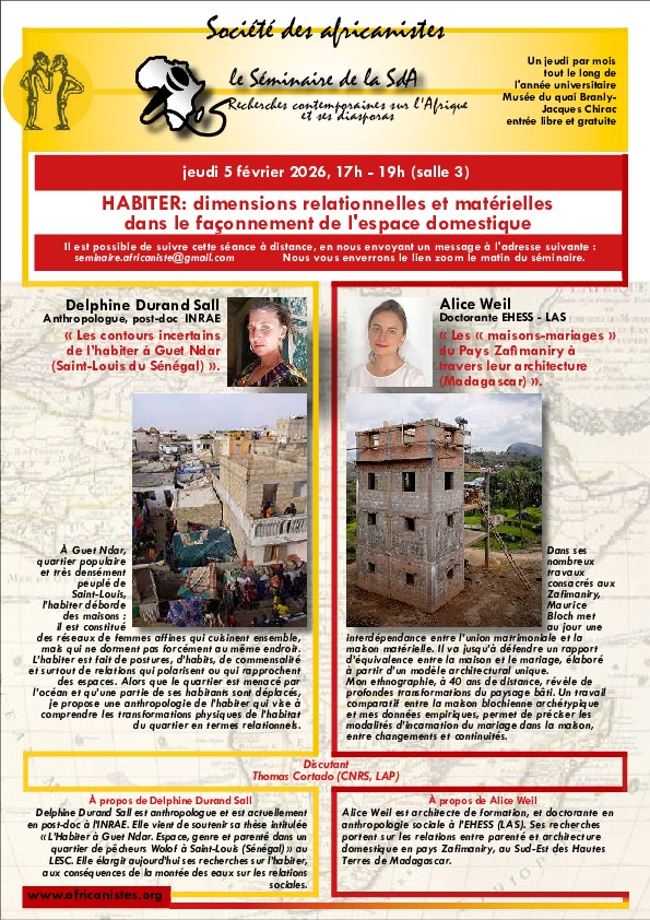 Delphine Durand Sall est anthropologue et est actuellement en post-doc à l’INRAE. Elle vient de soutenir sa thèse intitulée « L’Habiter à Guet Ndar. Espace, genre et parenté dans un quartier de pêcheurs Wolof à Saint-Louis (Sénégal) » au LESC. Elle élargit aujourd’hui ses recherches sur l’habiter, aux conséquences de la montée des eaux sur les relations sociales.