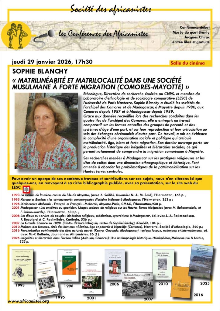 Ethnologue, Directrice de recherche émérite au CNRS, et membre du Laboratoire d’ethnologie et de sociologie comparative (LESC) de l’université de Paris Nanterre, Sophie Blanchy a étudié les sociétés de l’archipel des Comores et de Madagascar, à Mayotte depuis 1980, aux Comores depuis 1987 et à Madagascar depuis 1989. Grace aux données recueillies lors des recherches conduites dans les quatre îles de l’archipel des Comores, elle a entrepris un travail comparatif sur les formes actuelles des groupes de parenté et des systèmes d’âge d’une part, et sur leur reproduction et leur articulation au sein des échanges cérémoniels d’autre part. Ce travail, a mis en évidence la complexité d’une organisation sociale et politique qui articule matrilinéarité, âge, islam et forte migration. Son dernier ouvrage porte sur