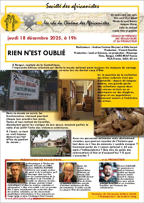 Anthropologue à l’Institut des Mondes Africains du CNRS, Andrea CERIANA MAYNERI s’intéresse aux usages sociaux du passé et de la mémoire, qu’il a interrogés dans leur lien avec les représentations de la sorcellerie et de l’invisible. Il travaille sur plusieurs terrains : en Afrique centrale (Tchad, Centrafrique), et dans les archives coloniales et missionnaires. « Rien n’est oublié » est son premier film. Il mène actuellement des recherches dans des archives coloniales, sur des mouvements prophétiques anticoloniaux et leur répression au Congo belge et dans l’Oubangui-Chari français.